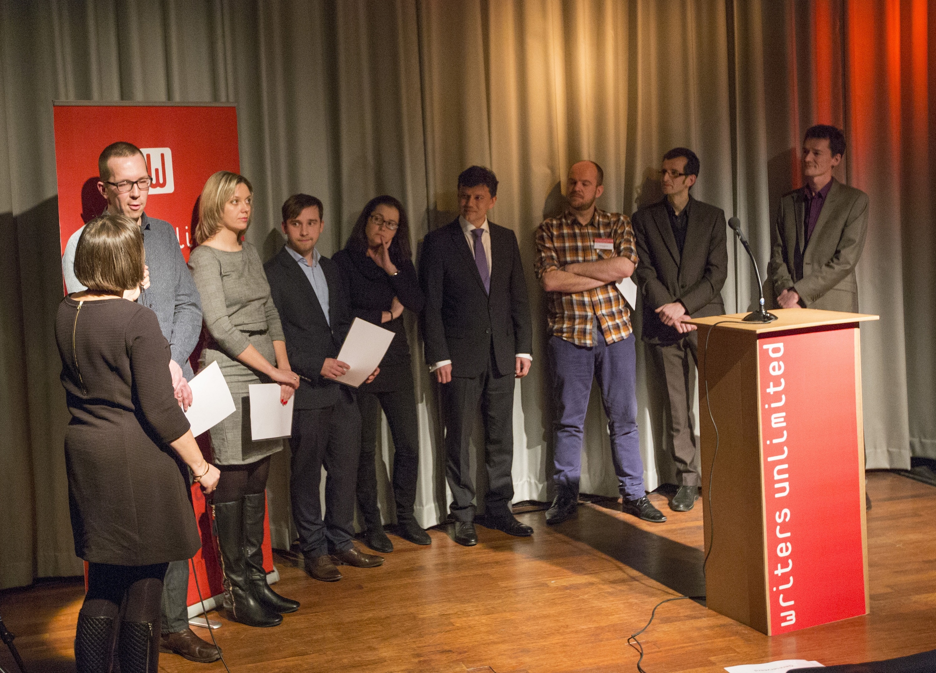 Van links: Małgorzata Woźniak-Diederen (Stichting Literatura), Gijs Franssen (winnaar), Maja Porczyńska (3.), Tomasz Berliński (2.), Natalia Zweekhorst en Piotr Perczyński (Poolse Ambassade in Den Haag), Witold Szabłowski, Kris Van Heuckelom en Eric Metz (juryleden) – Writers Unlimited Winternachten (foto Serge Ligtenberg © Serge Ligtenberg/Writers Unlimited 2015)