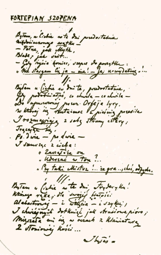 In het gedicht worden de laatste dagen van Chopin gememoreerd; Norwid’s bezoek aan de pianist. Het gedicht documenteert tevens de turbulente tijden na de Januariopstand in Warschau en refereert aan een gebeurtenis die de dichter zeer heeft geschokt en geraakt. Nadat in september 1963 een Russische delegaat in Polen werd vermoord, namen de Russische soldaten een wraak door het Zamoyski palais bij Nowy Świat te vernielen. De piano van Chopin die in dat palais werd bewaard, is toen op straat gegooid en kapotgemaakt… Luister naar de Poolse versie van het gedicht en lees hieronder de Engelse vertaling van Danuta Borchardt.
