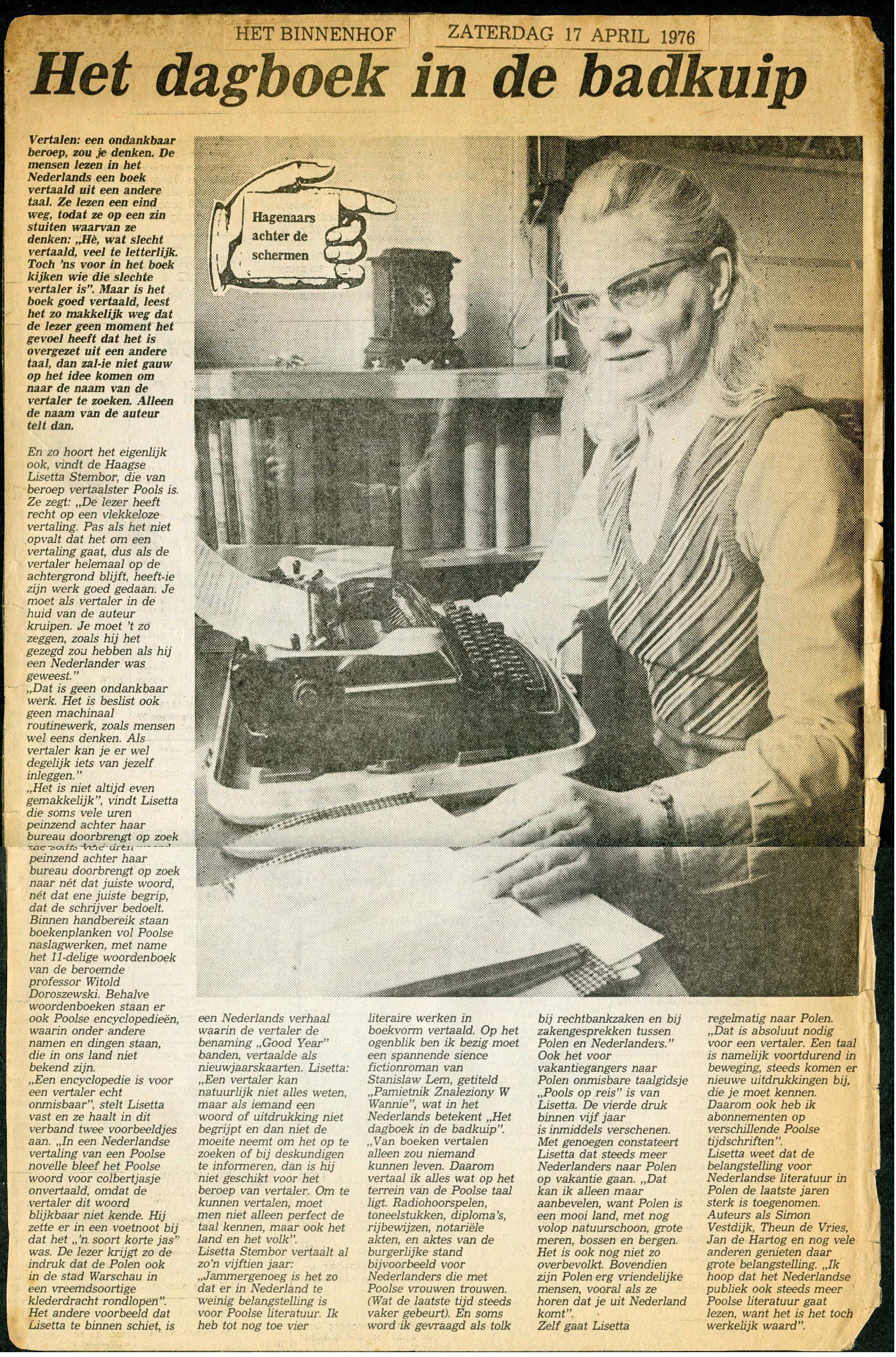 Een interview met Lisetta Stembor in Haagse krant Het Binnenhof uit 17 April 1976